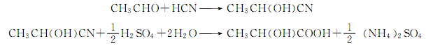 (1)乙醛法 以乙醛與氫氰酸為原料反應生成乳腈,經水解得粗乳酸,粗乳酸經酯化再水解得乳酸: